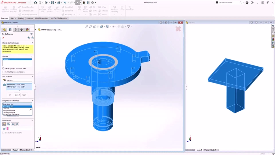 Description: In previous releases, the Silhouette defeature method was available only for assemblies. For single body and multibody parts, you can use the Silhouette defeature method to create a highly simplified part and make it associative to the parent part.