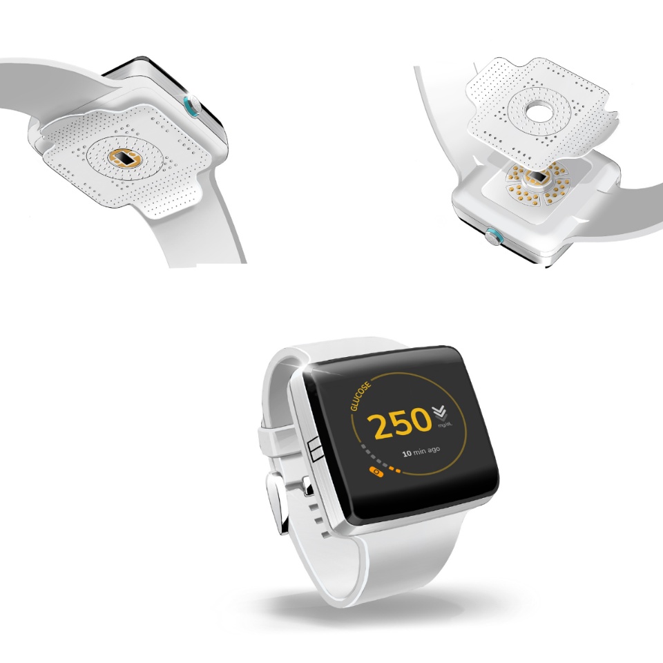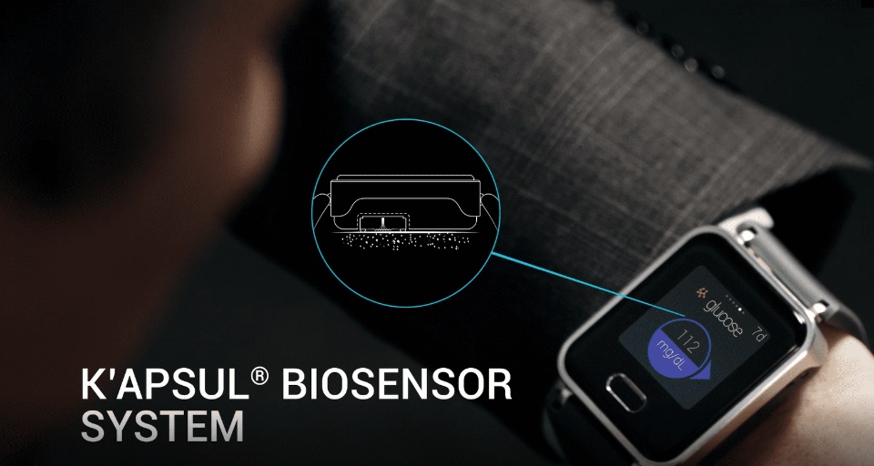K’Watch is a Continuous Glucose Monitoring (CGM) system embedded in a Smartwatch. It is composed of two parts: K’apsul, a weekly patch that is adhesived to the skin, and the Watch. It measures glucose levels from glucose molecules in the interstitial fluid reacting with biochemicals on microneedles. The Watch interprets the signal returned by the patch, store and display the information, and can sync it to the cloud via an app. K’Watch unique architecture disrupt user experience, accuracy and payer ROI.