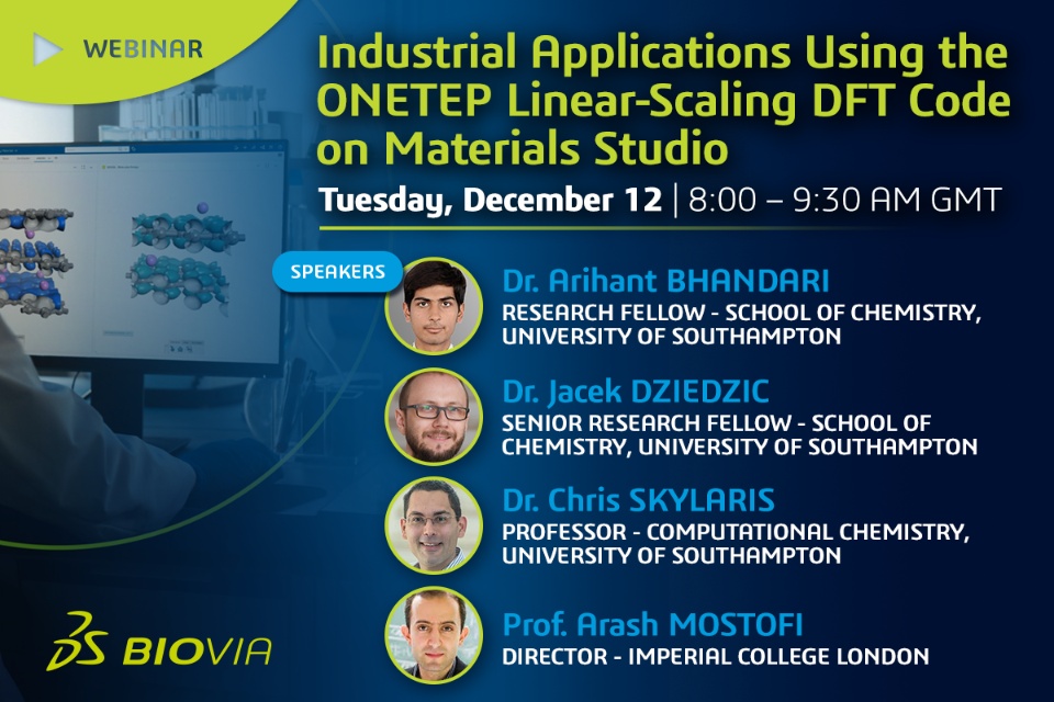 📆 Next week, join Dr. Arihant Bhandari, Dr. Jacek Dziedzic, Dr. Chris Skylaris and Prof. Arash Mostofi for an insightful webinar on #ONETEP, the innovative code transforming Density Functional Theory (#DFT) calculations in Materials Studio. The webinar will provide a detailed overview of ONETEP’s capabilities and its recent enhancements that are setting new standards within Materials Studio: http://go.3ds.com/s4U.