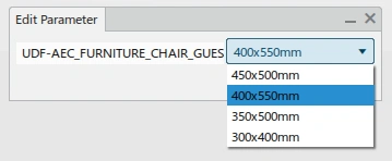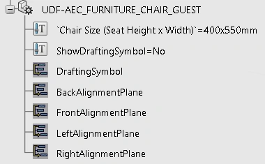 Furnishing type of a guest chair. Object type includes an engineering template and UDF definitions for use with the Component Specification tool as well as a Design Table to configure all sizes required.
