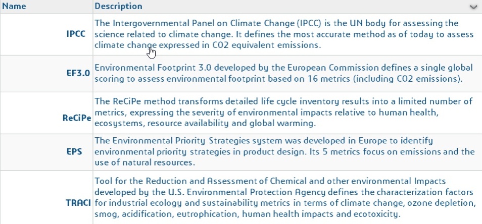 The aim of this step is to select the environmental indicators that could be of interest to a specific stakeholder of the project. This will allow to choose the right environmental method. To know, five methods are available in our Ecodesign apps as following.