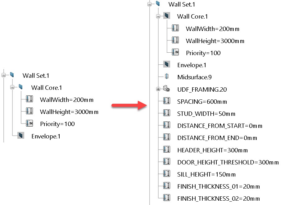 For the Object Type to be correctly instantiated, it has to be created as one of the above options with ONLY these inputs and the EXACT naming you see here. For example, I'm sharing the wall framing Object Type below from the What's New video, in this case both the User Defined Feature and the Engineering Template take in a Mid-Surface and WallThickness as inputs.