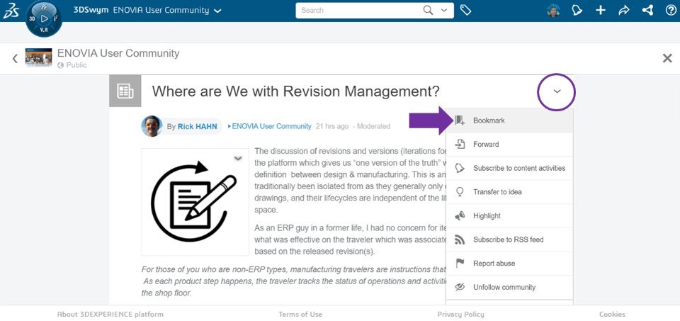 This feature is great when you find a post in the community that has key content that you want to keep for reference. Or you might be interested in continuing to follow comments and updates on a particular post. Or maybe something caught your interest and you want to read it later.