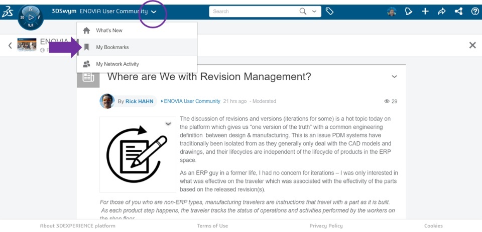 2) To view your bookmarks, click on the down arrow at the top of the page (next to the community name in the blue bar). Then click on "My Bookmarks."
