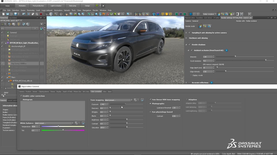 By using correct parameters of the camera, surrounding and post process effects, you can display your model in an artistic or calibrated way, to get marketing or engineering and perceived quality perception of your model.