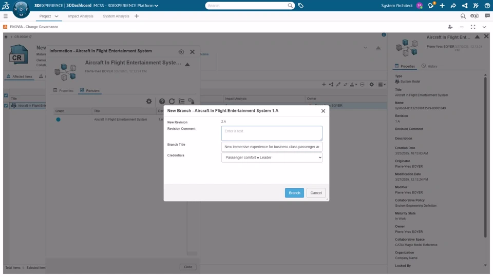 She access to the context of her activities from the change request and the impact analyzis. She manages the lifecycle of the system model and creates a branch to work on an isolated environment. She performs system architecture authoring and commit in CATIA Magic. She uses the impact analyzis to request simulation study environment to the simulation engineer.