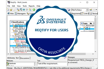 CATIA Reqtify for Users - AssociateThis certification validates your knowledge and skills on CATIA Reqtify for Users. You will be asked multiple-choice questions (MCQ) on how to manage the Reqtify project and analyze traceability using impact analysis, suspicious links and filters. You will also be assessed on your ability to create a connection profile and generate reports. | ||