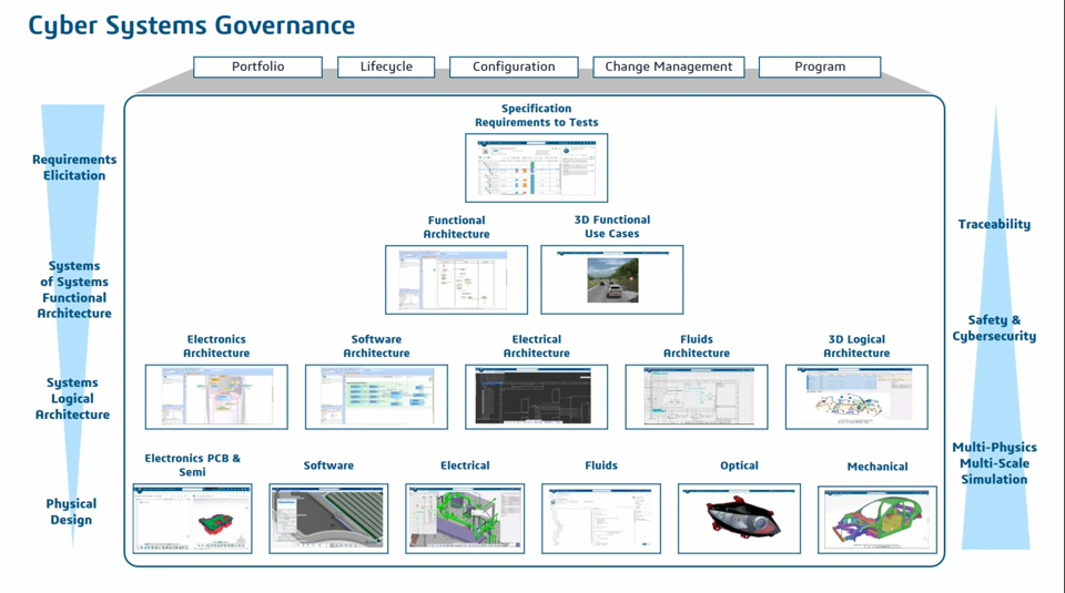 The following picture describe the multi-level / multi-discipline referential of CATIA cyber systems from requirements to physical design.
