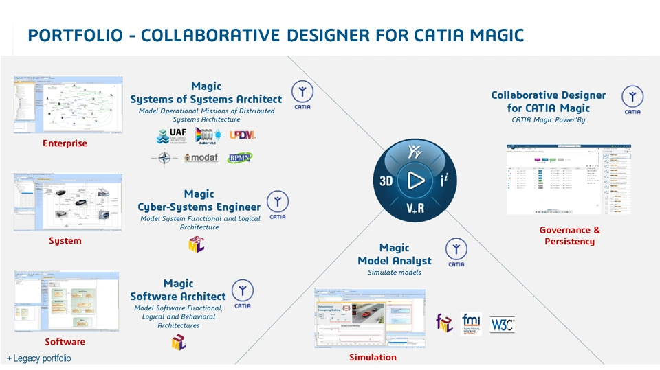 CATIA Magic is a powerful portfolio of modeling tools that supports Model-Based Systems Engineering (MBSE). It provides comprehensive UML (Unified Modeling Language) and SysML (Systems Modeling Language) capabilities, enabling clear visualization, analysis, and communication of complex system designs. Cameo integrates seamlessly with frameworks like UPDM and UAF , ensuring compliance with industry standards for enterprise architecture.
