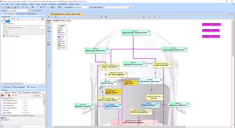 - Systems Logical Architecture : Systems Logical architecture is the description of the virtual twin using specific discipline vocabulary and representation (Electronic, Software, Electrical, Fluids, 3D Logical for the zone management).