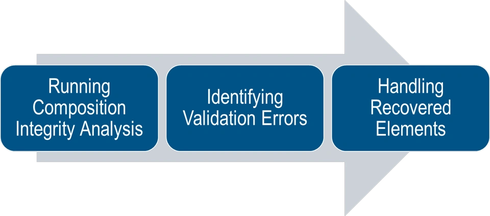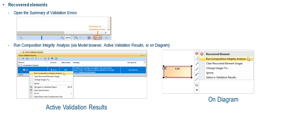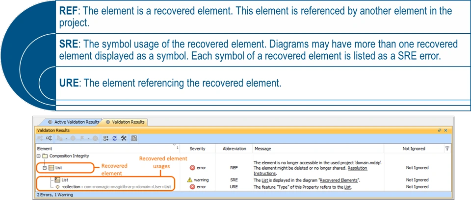 •Restore recovered elements. This is the case when recovered elements no longer exist but can be restored from the bits of information the modeling tool still has. The restored element has only ID, name, and type.