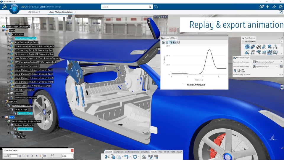 Motion Design enables mechanical designers to predict the mechanical behavior of their assembly under motion and loads and structural strength of parts as a design assessment. These validation phases save time and money by removing the tasks and exchanges with analysts for a first validation. Moreover, human manikins can defined and positioned in the product to have a first check of human-product compliance and prepare work for ergonomists.