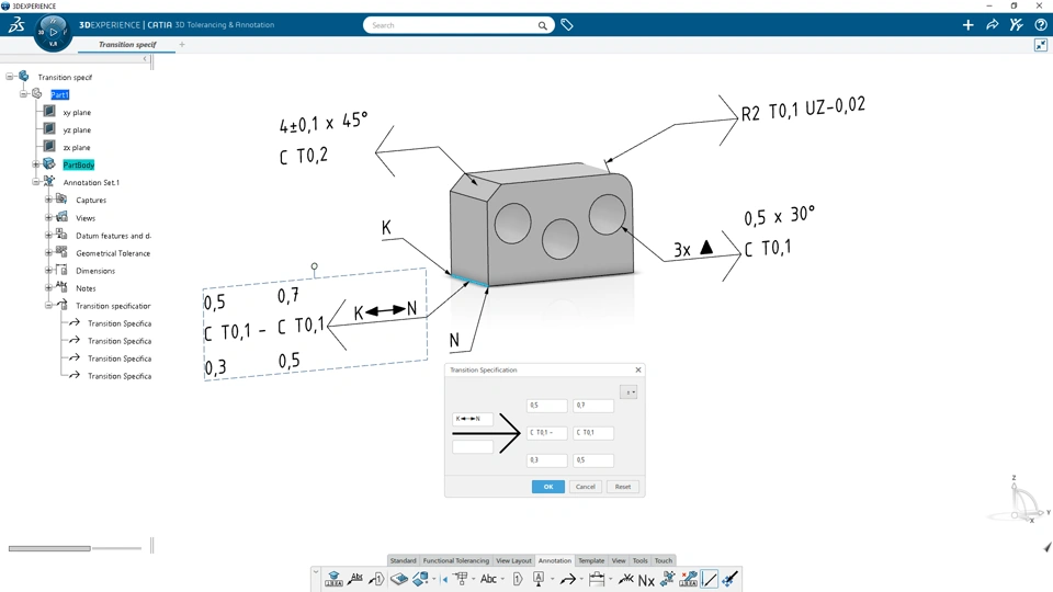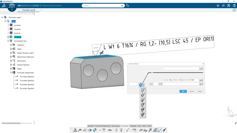 2. Ensure the engineering characteristics specifications for manufacturing are compliant with latest standard for ISO 21920-1:2021 by supporting surface textures and ISO 21204:2020 for transition specifications (radius, chamfer).