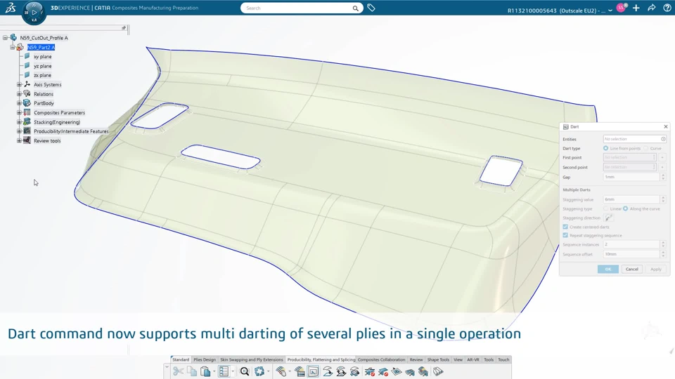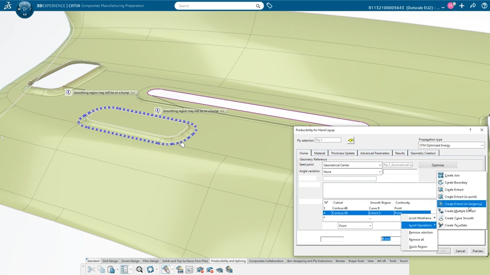 2. The producibility analysis now automatically accounts for cut-out in the plies by generating the corresponding Smooth regions, or propose a quick way to design the curves to be used as input of the Smooth region