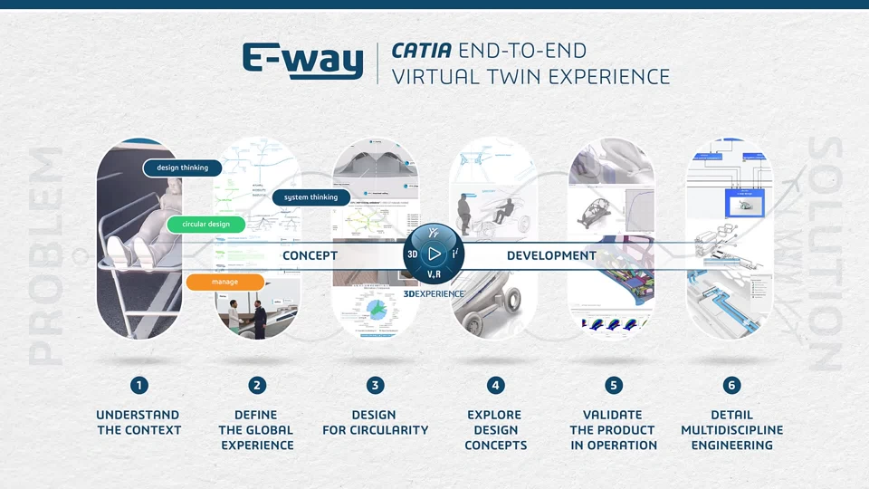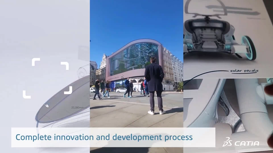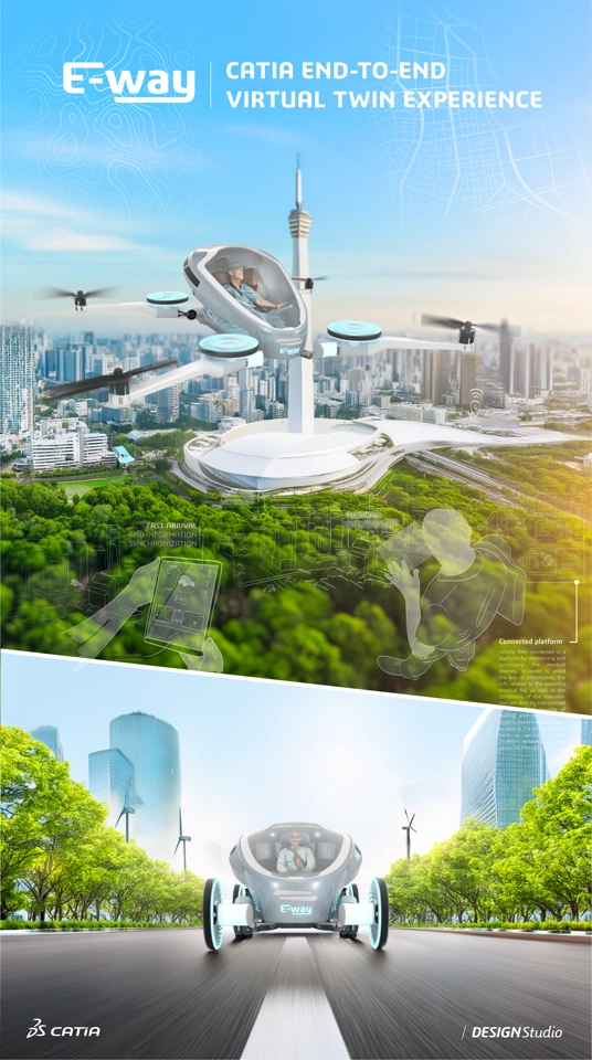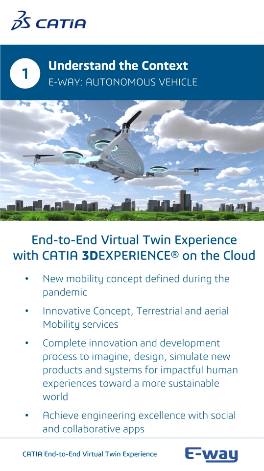 | Demo 1 - Understand the Context The e-way is a new mobility concept, initially designed during the pandemic to alleviate hospital staff by ensuring non-medicalized patient transfer. This innovative concept utilizes both terrestrial and aerial mobility services. An updated and more developed version was created recently to give it a new life. As the pandemic is less a trending topic, it was important to give the e-way a reason for being. This is why we developed a completely new innovation process to imagine, design, and simulate a new product and systems for impactful human experiences toward a more sustainable world. For that, a whole team of CATIA experts worked on this project, integrating knowledge from the whole CATIA portfolio, including creative design, system engineering, concept & mechanical engineering, MODeling and SIMulation (MODSIM), electrical & fluids, sustainability and construction. This engineering excellence was achievable with social and collaborative apps on the 3DEXPERIENCE platform, allowing remote work and use of different devices between the design and engineering teams, facilitating a nomadic and collaborative design process. This project was even exposed during the Dassault Systèmes “Virtual Worlds for Real Life” marketing operation at Piccadilly Circus, from April 29th to May 5th 2024. It was possible to experiment an augmented reality experience that allows you to see a virtual e-way flying in London. |