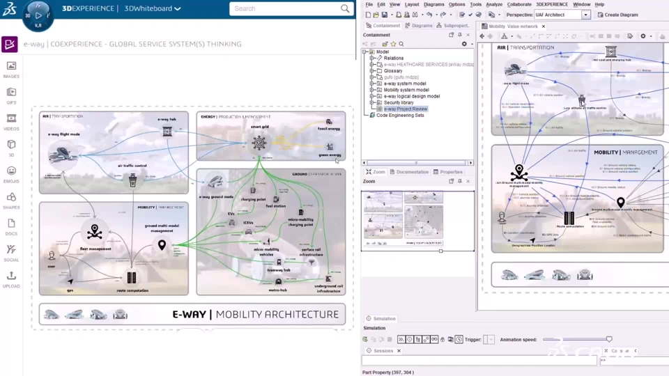 | Demo 2 - Define the Global Experience The systemic approach integrates the product with its relation to humans, stakeholders, and its environment. We need to take into account the global experience to ensure all the parties involved are satisfied. Mixing design thinking (for a better user experience) and system thinking (to meet the ecosystem requirements) helps question the vehicle's usage, the global service offered, but also the business strategy, the taxonomy, and the sustainable goals that the company wants to reach. This is why creative tools were used, such as 3DEXPERIENCE Whiteboard, to start mapping the system, the user journey, and different scenarios and use cases that could happen in real life. Then, by entering these creative journeys and scenarios into CATIA Systems solutions, we could provide a global vision of the experience and the various use cases, and thus address the company's multiple goals in terms of design quality, reliability and sustainability. The scenarios are mapped into the system, so we can understand the links, enrich the user journey and simulate it by adding intelligence, for example with time constraints (how long it takes the e-way to get to the site of the accident?) This systems approach is a global approach that helps designers, architects and engineers to identify project priorities, even at an early stage of the process, to ensure smooth collaboration. User Roles