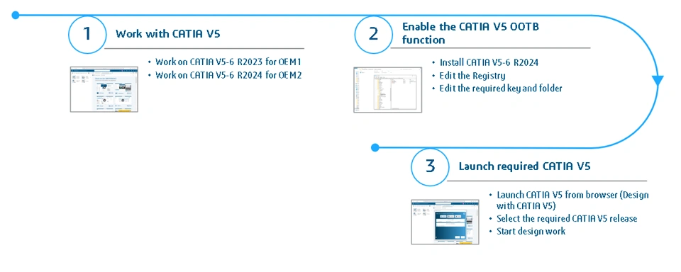 By enabling the OOTB function of Collaborative Designer for CATIA V5, OEMs and suppliers can manage multiple releases of CATIA V5 within a single 3DEXPERIENCE platform.