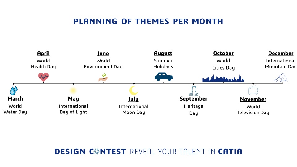 The CATIA Marketing team offers you a monthly design contest around a defined theme (thematic calendar below) and which will be linked to an issue for a better and more sustainable world ♻🌍.