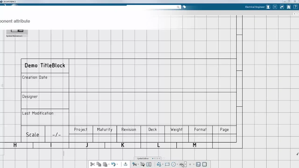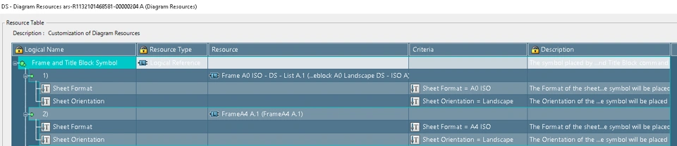 Frame and Title block are defined inside a Logical Reference object inside a symbol rep.