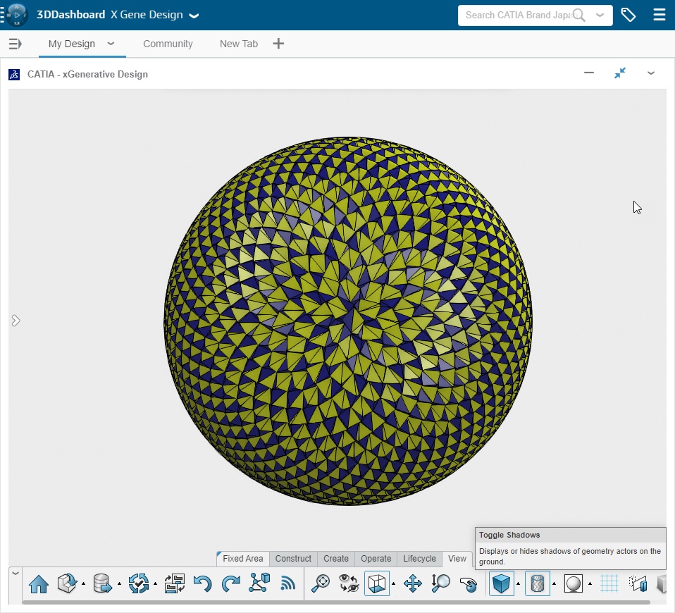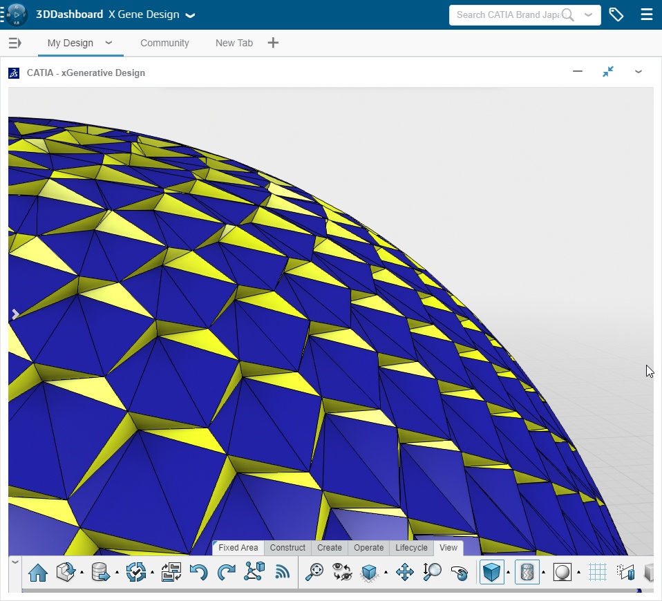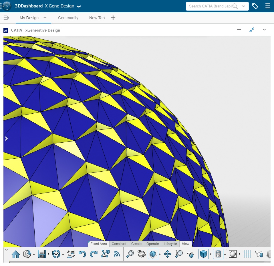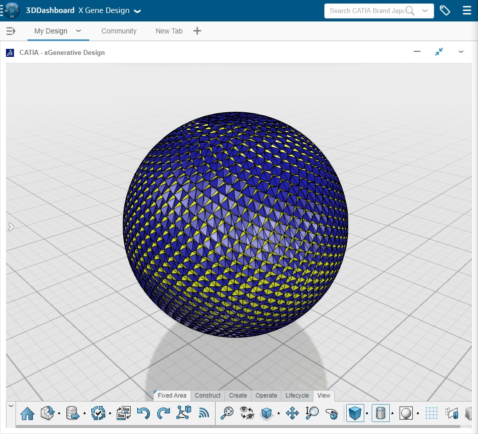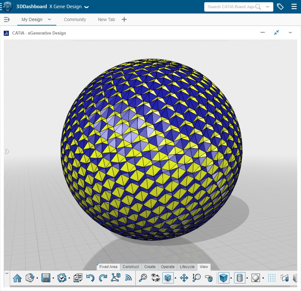 this is a Fibonacci grid on a sphere. Each cell with a center translated toward the interior of the grid. The centers are excentered little by little from bottom to top. but it was difficult to understand the transition monocolored. so I used 2 color to make it clearer.