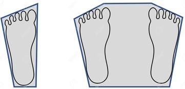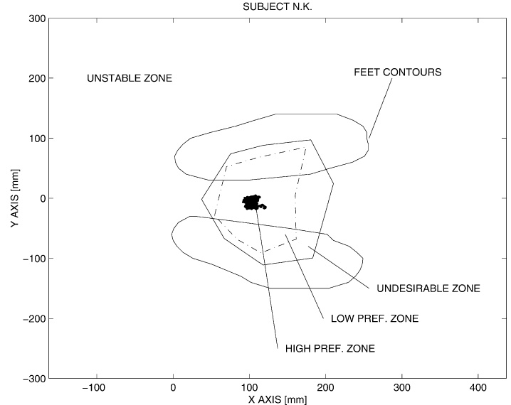 In order to predict such plausible posture, some constraints are imposed on the DHM. First, postural stability is ensured by constraining the floor projection of the center of gravity (COG) inside the base of support. The base of support, also known as sustentation polygon, is the area enclosing the body extremities (e.g. feet, hands) in contact with the environment (e.g. single foot, two feet, two feet + single hand). The closest the COG is from the boundaries of the base of support, the more difficult is to keep postural stability. For that reason, the COG is constrained within a "region inside a region', i.e. the high preference zone inside the base of support (Fig. 3, Popovic et al. 2000). The COG control in multiple supports is possible through the concept of augmented bodies (Boulic et al. 1997). Note that the EWD application has been originally designed to deal with postures with the two feet touching the same horizontal floor. More complex scenarios may eventually involve single or both hand bracing, which would affect the sustentation polygon.