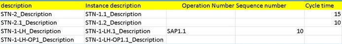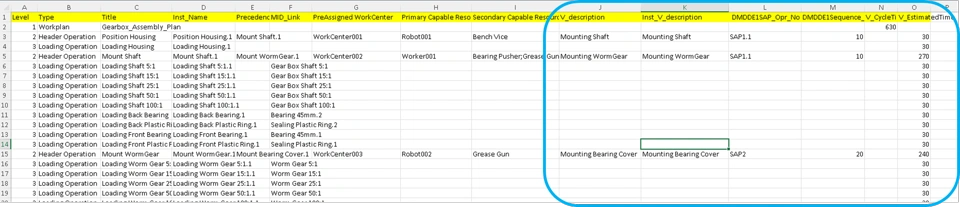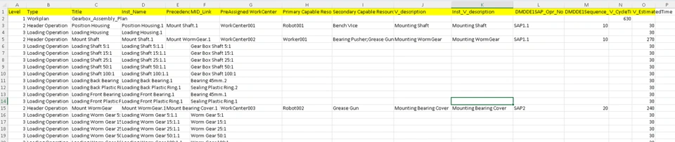 To set other extra attributes of the created objects, add extra columns in the excel file after column 9. 1st 9 columns are reserved for Level, Object type, Title(Reference Name), Instance name, Precedence link, MID Link, Preassigned WorkCenter, Primary and Secondary Capable Resource. While creating the column, column name should be the attribute name. Add the values in respective rows. While setting the column name for attribute of instance object, add “Inst_” as a prefix in the column name.