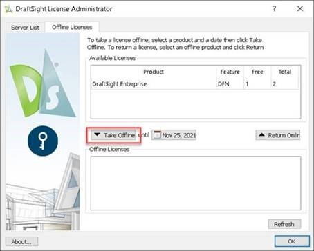 2. Select DraftSight license>specify date\\time and click Take offline