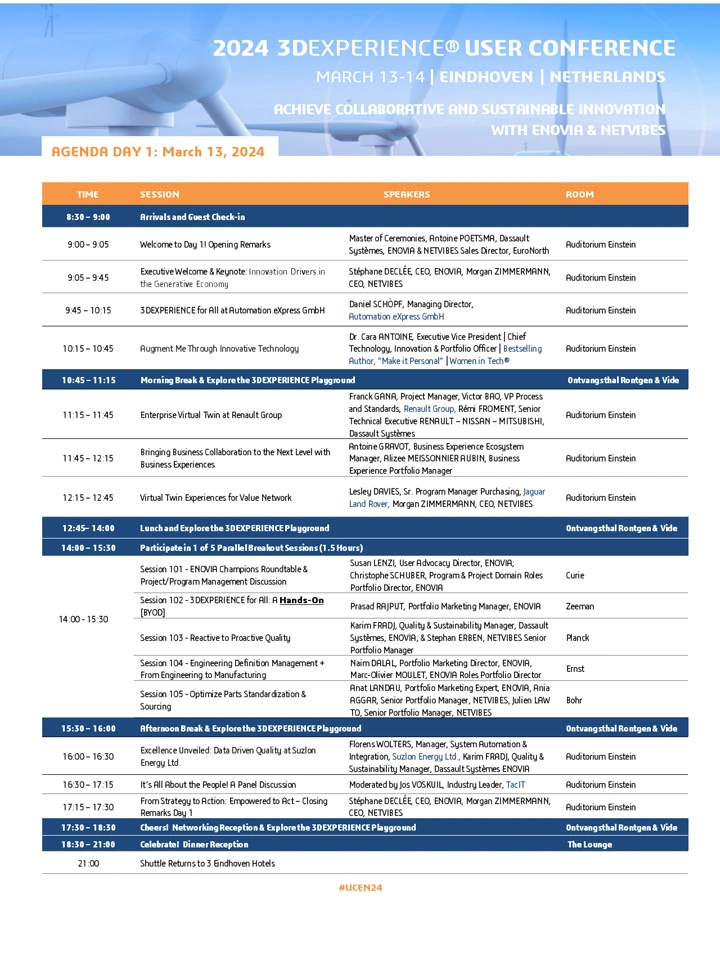 Check out the full 2-day agenda for the 2024 3DEXPERIENCE User Conference in Eindhoven, Netherlands. View the website here.