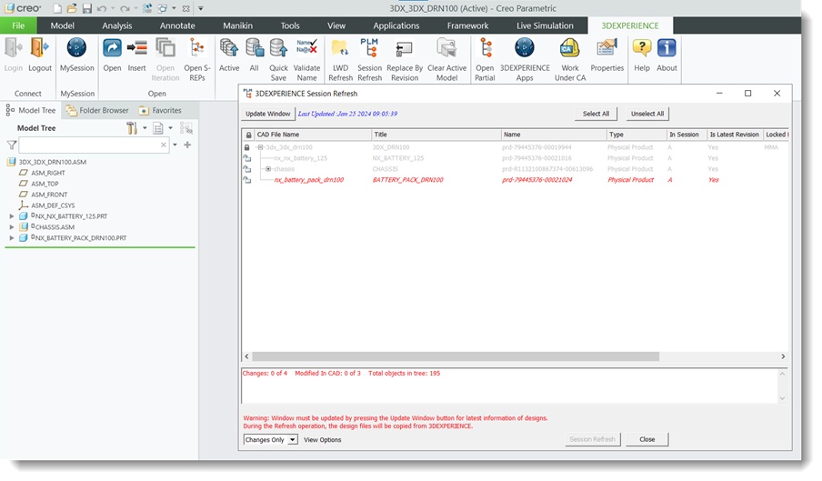 How Perform a “Session Refresh” on MultiCAD structures containing non-native parts, the modified non-native parts will be visible in red The user selects the highlighted parts and performs “Session Refresh” to update them to the latest revision |