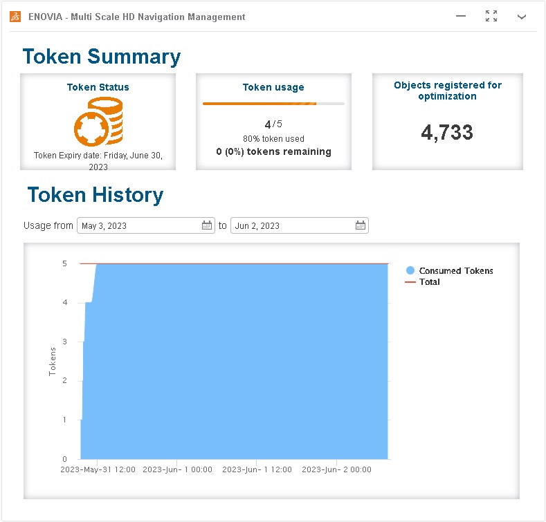 How A new application “Multi Scale HD Navigation Tokens Management” is now available for admin users, that details the VIK token (*) consumption. The app will show the following info: 1. Token Summary >> Token Status >> Token Usage >> Objects registered for optimization 2. Token History The number of consumed tokens in a given period of time. - This app is available on cloud only - The usage of this app is available for users that are: 1) granted the role “Collaborative Industry Innovator (CSV) 2) have admin rights (*) VIK-OC: Multiscale Twin High Definition Navigation Pack (100,000 3DShape) |