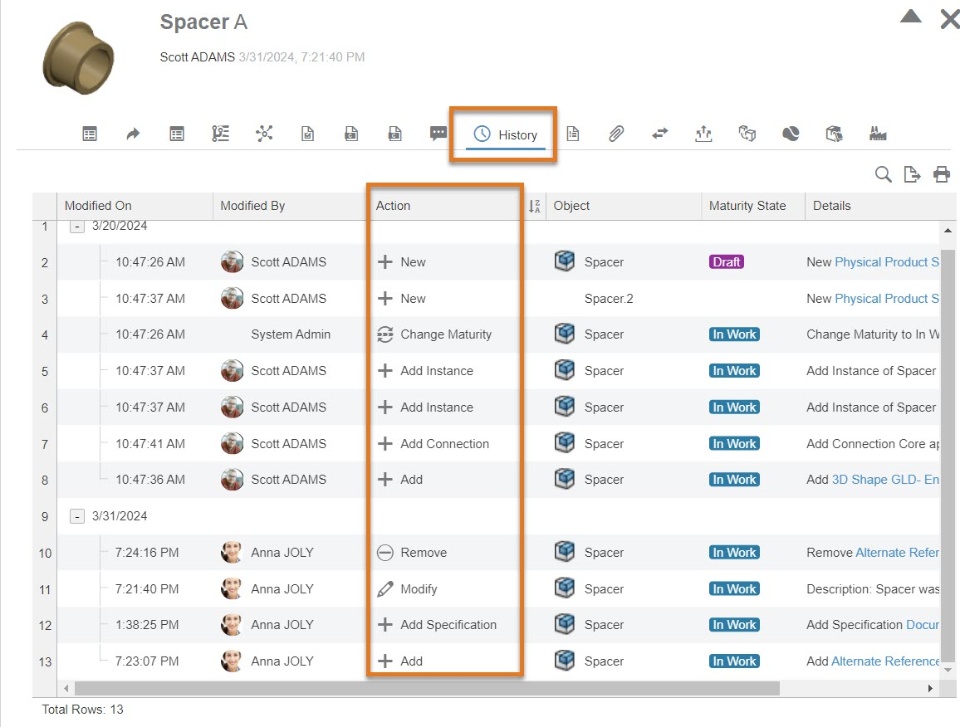 How •New tab ‘History’ is added to the Information panel in the ‘Collaborative Lifecycle’ application. •The ‘History’ tab displays history details of a selected object ,including: •Modified On •Modified By •The Action •The Maturity State •The Details.