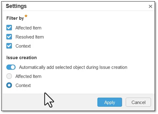 A new setting “Issue creation” is available for you to automatically add a selected object (from the Filter) to the new issue. The setting determines if this selected object is added to the new issue as: -Affected Item Or -Context