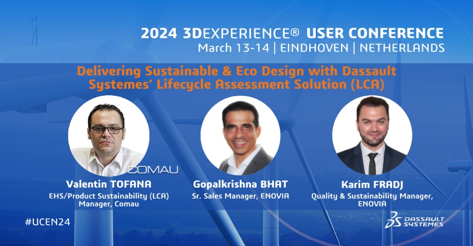 Delivering Sustainable & Eco Design with Dassault Systemes’ Lifecycle Assessment Solution (LCA) 9:45 – 10:30 | Valentin TOFANA, EHS/Product Sustainability (LCA) Manager, COMAU Gopalkrishna BHAT, Sr. Sales Manager, ENOVIA Karim FRADJ, Quality & Sustainability Manager, Dassault Systèmes ENOVIA |  Ask Questions. |