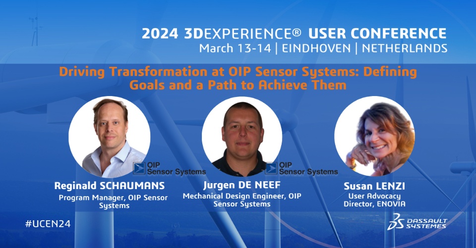 Driving Transformation at OIP Sensor Systems: Defining Goals and a Path to Achieve Them 12:00 – 12:30 | Reginald SCHAUMANS, Program Manager, OIP Sensor Systems Jurgen DE NEEF, Mechanical Design Engineer, OIP Sensor Systems Susan LENZI, User Advocacy Director, ENOVIA |  |