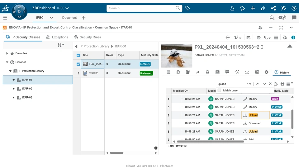 How New tab ‘History’ is added to the Information panel in the ‘IP Protection and Export Control Classification’ application. The ‘History’ tab displays history details of a selected object ,including: