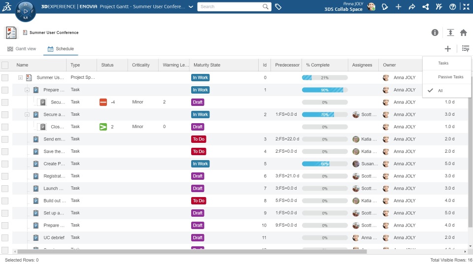 How •A new tab ‘Schedule’ is added to Project Gantt widget displaying the project and its tasks structure in grid view. •Using the ‘Schedule’ view you can: •Filter the view to display: •All tasks •All tasks except Passive Tasks •Only Passive Tasks