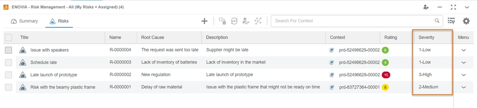 How The Risk Severity is based on the Risk Impact and the Risk Probability. Until now, the severity of the risk was represented only by the various colors in the Risk Matrix. (Green, Yellow, Red) Now, a new field, ‘Severity’ is introduced and available for Risk and Opportunity in the: Creation dialog Table View Property Panel