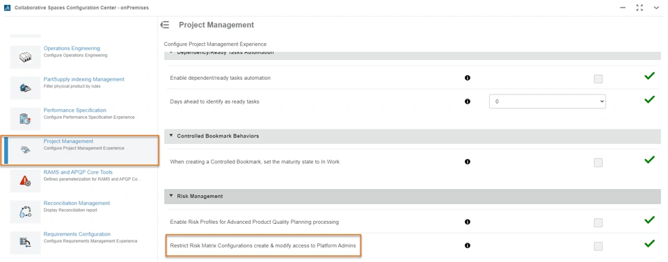How A new setting ‘Restrict Risk Matrix Configuration create & modify access to Platform Admins‘ is now introduced and available in the ‘Collaborative Spaces Configuration Center‘ widget under ‘Project Management’ -> ‘Risk Management’ section. It allows you to control who can configure the Risk Matrix Configuration. In case the setting is set to : False (the default), the behavior remains the current behavior: Project Leaders can create and modify the Risk Matrix Configuration True, only users with platform admin privilege can configure the Risk Matrix Configuration.