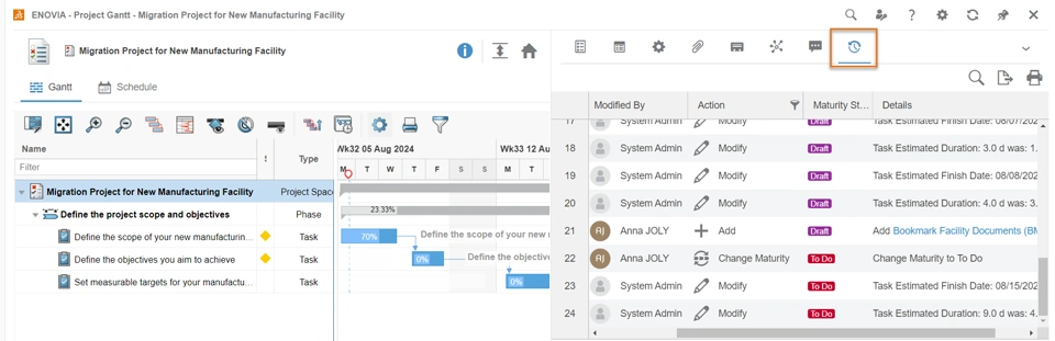How A new tab ‘History’ is added to the Information panel in the ‘Project Gantt’ app. The ‘History’ tab displays history details of a selected project entity including: Modified On Modified By The Action The Maturity State The Details