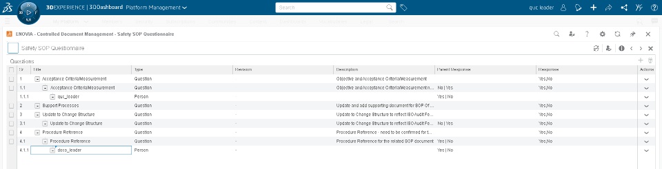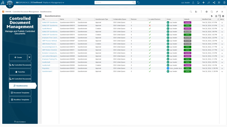Manage Questionnaires in 'Controlled Document Management’ widget |
