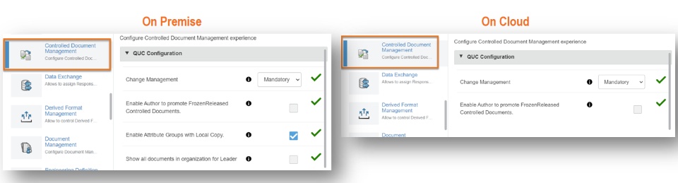 How •The ‘Quality Document Control’ category ‘Collaborative Spaces Configuration Center’ is now renamed to ‘Controlled Document Management’. •Only applicable settings are displayed for On Premise and On Cloud Environments |