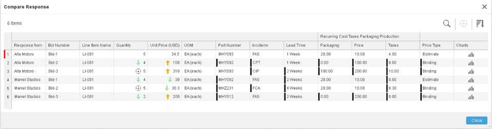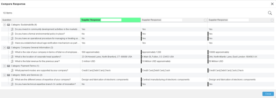 How •A new response comparison view is introduced that allows you to easily compare all bids or responses to RFI questions by highlighting differences with target bid / target supplier response. •You can select any bid / supplier response to be set as a reference to compare.