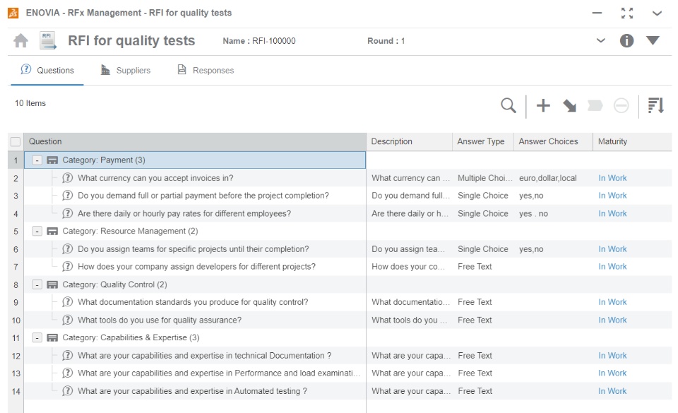 RFI Questions: •RFI contains a list of questions which are used to gather information about a product or a service from the suppliers. •You can create questions: •Globally – these questions can be reused across RFIs •Directly in the RFI •You can configure Question Category Library, in the Setting tab, under Configuration section, to be used for grouping questions per predefined categories. •Suppliers can respond to the questions using the Supplier Connect Portal. |