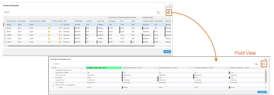 How •A new compare view ‘Pivot View’ is introduced for RFQ compare responses, allowing you to switch from horizontal view to vertical view and display the bids in the columns. •You can toggle between the default view and the Pivot View using the ‘Pivot View’ icon in the ‘Compare Responses’ toolbar