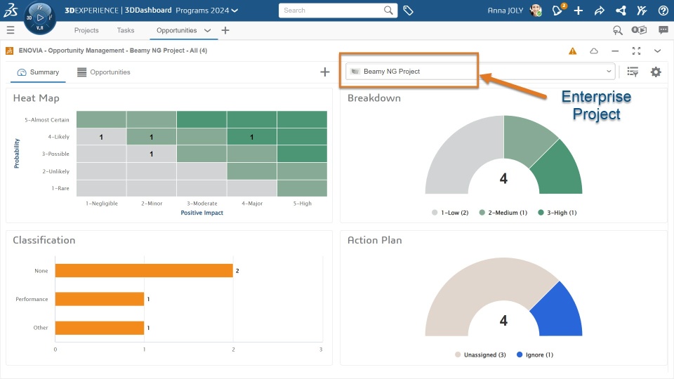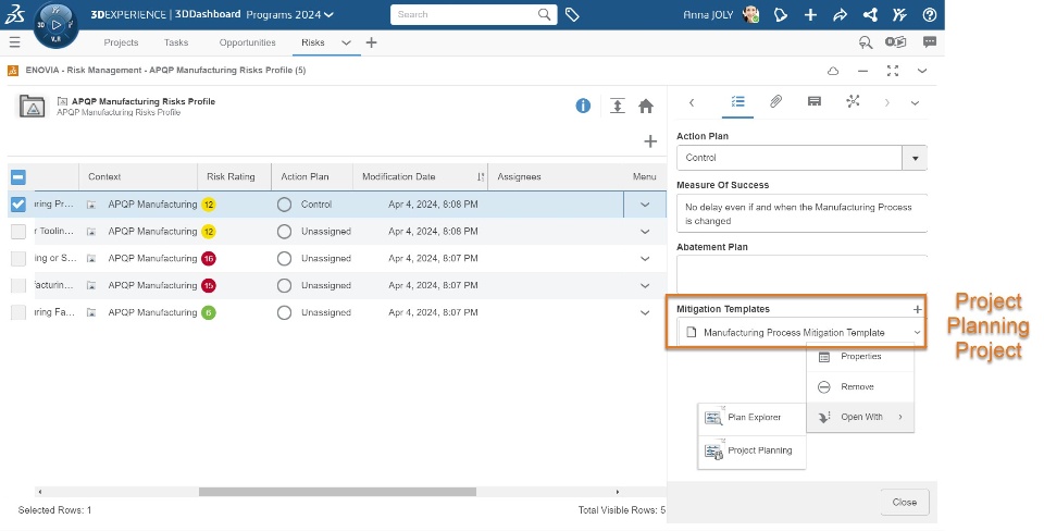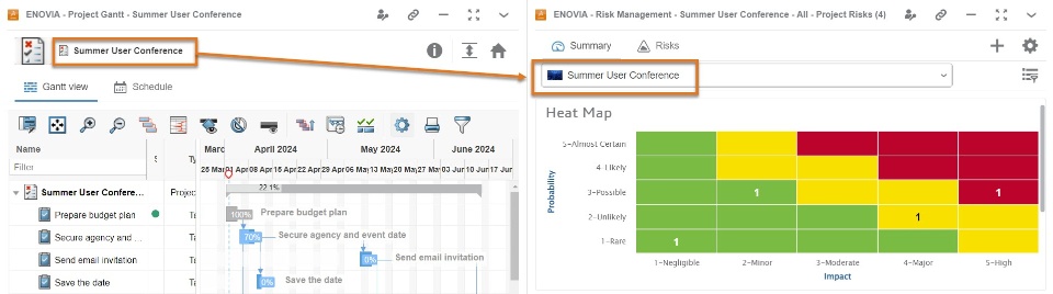 How •You can now link between the Project Gantt widget and the Risk Management or Opportunity Management widgets. •When the widgets are linked, when you open a project in the Project Gantt app, the selected project is automatically set as a context in the Risk Management application.