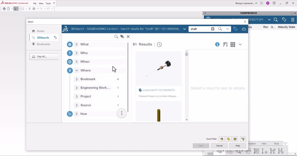 Search your files saved on the 3DEXPERIENCE Platform using the 3DEXPERIENCE Open Dialogue Box in SOLIDWORKS Connected.