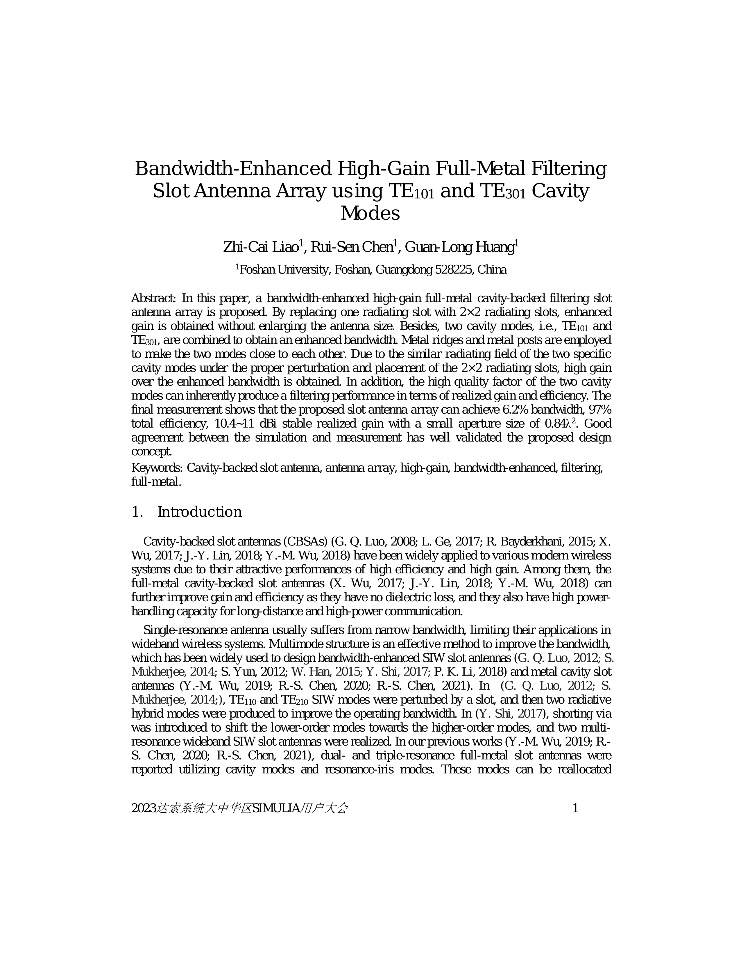 | 弯折短路微带缝隙贴片天线设计 | 汽车车门嵌饰板传导电压法仿真研究_延锋国际汽车技术有限公司_梅燕 | 紧凑型双端口介质加载去耦天线系统 | 背腔缝隙天线 |