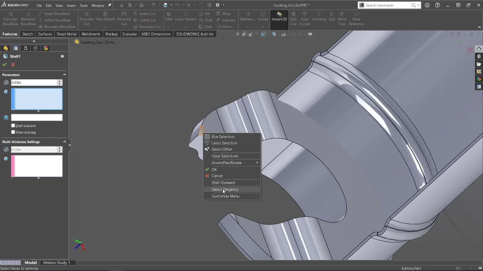 For this session, we will create a model of a caulking gun that is used to apply adhesive. This is a curious piece of geometry because it can be completed a number of different ways. However, the way we are going to build this model is very specific. We will construct this geometry as a multi-body part, specifically using 2D sketches to create solid geometry, as well as sheet metal geometry. Furthermore, we will control this part using sketches with associative relations that will tie into the constraints for everything else. This will allow us to make changes to our design efficiently and quickly.
