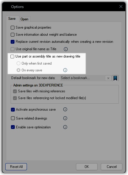 The MySession option highlighted in the image to the right determines the Title behavior for drawings.
