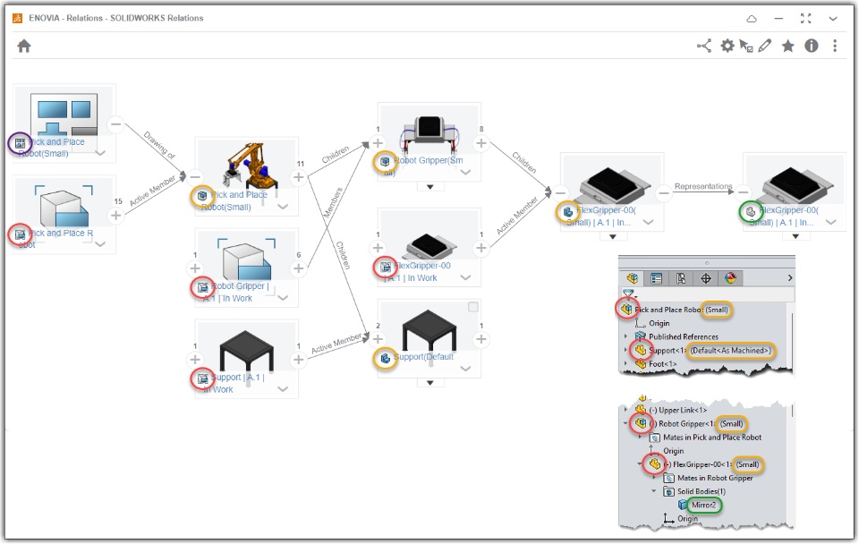 - Creates objects that represent and link to your SOLIDWORKS files.